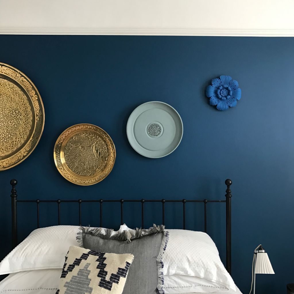 In this stunning bedroom, stylist Katie Sellers has chosen the dark navy shade Toy Soldier and teamed it with a cool white ceiling and brass accessories. The result is a dramatic yet easy to live with bedroom colour scheme that is both elegant and contemporary.